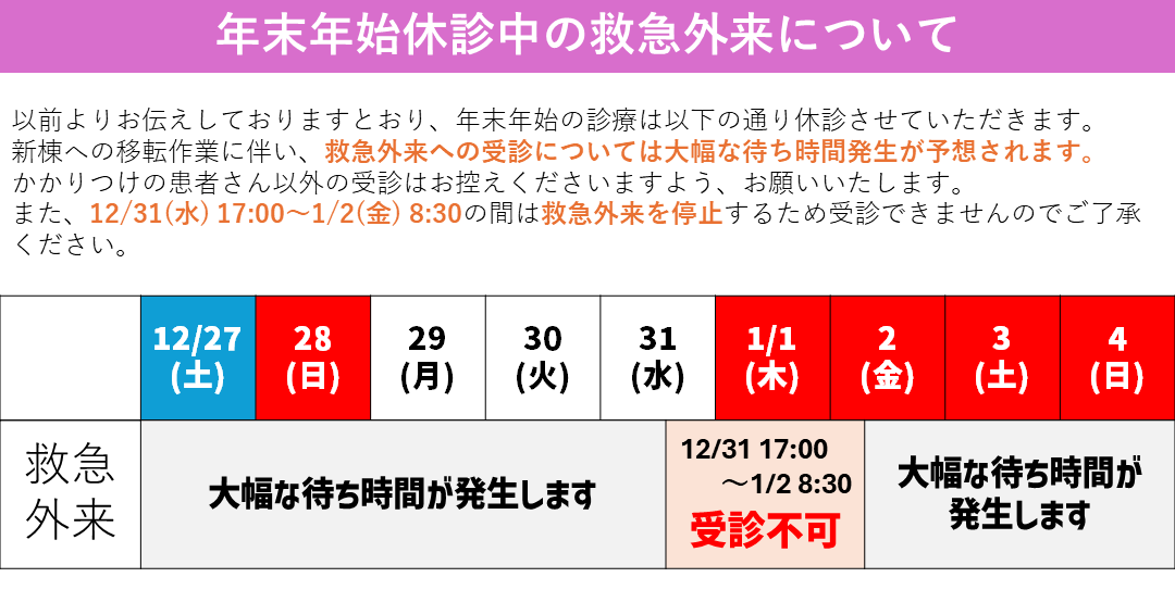 以前よりお伝えしておりますとおり、年末年始の診療は以下の通り休診させていただきます。 新棟への移転作業に伴い、救急外来への受診については大幅な待ち時間発生が予想されます。 かかりつけの患者さん以外の受診はお控えくださいますよう、お願いいたします。 また、12/31(水) 17:00~1/2(金) 8:30の間は救急外来を停止するため受診できませんのでご了承ください。